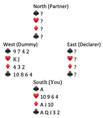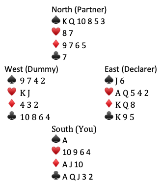 South leads the A♠️ against East’s 3♥️ contract. Partner (North) plays the 3♠️ and declarer contributes the 6♠️.