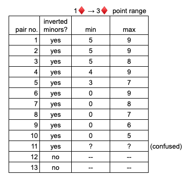 2. “What is the point range for a 3♦️ response to a 1♦️ opening?”