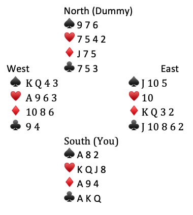 When this hand was played, Declarer ducked the first two rounds of ♦️s.  He ended up winning three ♣️s, one ♦️, two ♥️s, and one ♠️.  Seven tricks for down one and a 40% board.  Covering the 10♦️ was worth one more trick and an 80% board.