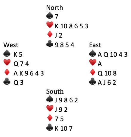 South’s 2♥️ play on the first trick strongly suggests she/he does not have the K♥️. From that assumption we can posit North’s 6♥️ opening lead as fourth best from the K♥️. Using the rule of eleven or observing that North has played two ♥️s below the 6♥️–we conclude that North started with six ♥️s and South started with three ♥️s. Bottom-line, South has no more red cards.