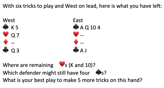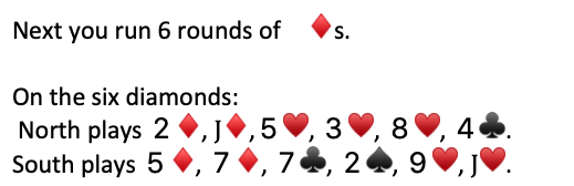 Case 2: If North plays a ♠️ when the K♠️ is led, then South has a maximum of four ♠️s left (South discarded 2♠️ earlier). Run the ♠️s and if the J♠️ does not drop then lead the last ♠️ (10♠️) to put South in with her/his J♠️. South will be forced to lead a ♣️ giving you your 12th trick.