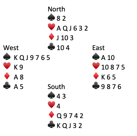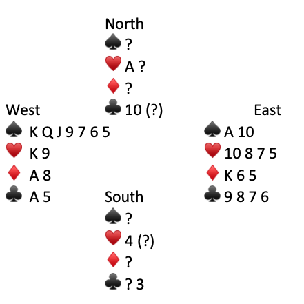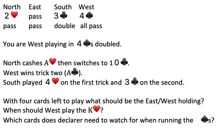 North’s 2♥️ opening should be a six card suit, therefore only North can protect ♥️s. The play to the first ♣️ trick looks like the 10♣️ is North’s highest ♣️. That seems reasonable given South’s 3♣️ bid. Therefore only South can protect ♣️s. Add in the ♦️ threat card and we have the makings of a double squeeze. Here is our target ending [West to lead]–