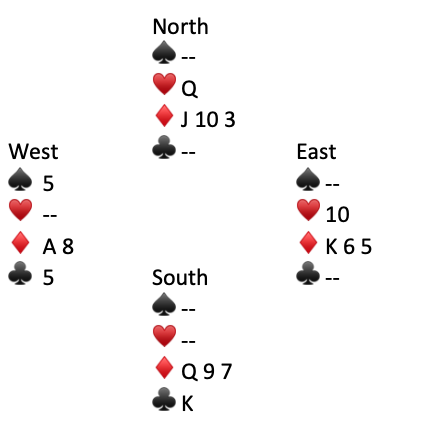 West plays the last trump and North is squeezed. North needs to save the Q♥️ so she/he discards a ♦️. East’s ♥️ threat has done its job, so East discards 10♥️. Now South is squeezed in ♦️s and ♣️s. South saves K♣️ and discards a low ♦️. Both defenders have only two ♦️ left so East/West win the last three ♦️ tricks.