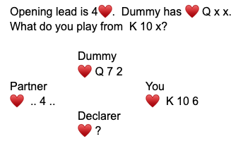 In this NT contract Partner may have lead away from the A♥️. Don’t stress over it. You should still put in the 10♥️ and save your K♥️ to capture Dummy’s Q♥️. Whether Partner has the A♥️, the J♥️, both, or neither– you should still put in the 10♥️. Think of it this way–do not let Declarer win with the Q♥️.