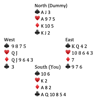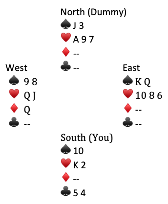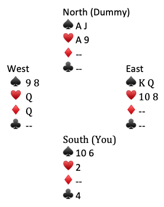 At first glance it looks like our threat cards are 9 ♥️ and J ♠️. The J ♠️ is a problem because Dummy might get squeezed before East. Here is what might be the ending of our squeeze attempt: