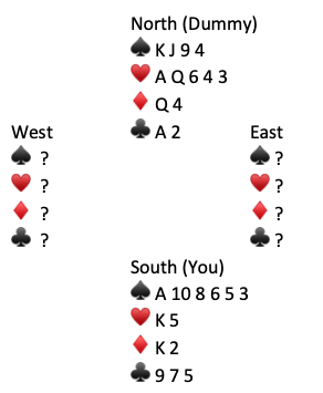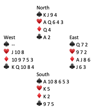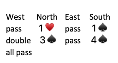 The principle of vacant spaces says that the probability that an opponent holds a particular card is proportional to the number of vacant spaces remaining in their respective hands. West’s double on round two shows both unbid suits. Presumably West is 5-5 or 5-4 in the minors. In our search for the Q♠️–West has three or four “vacant spaces” and East has 12 “vacant spaces”. We should play East for the Q♠️. Start trick two with dummy’s K♠️. Here was the entire deal: